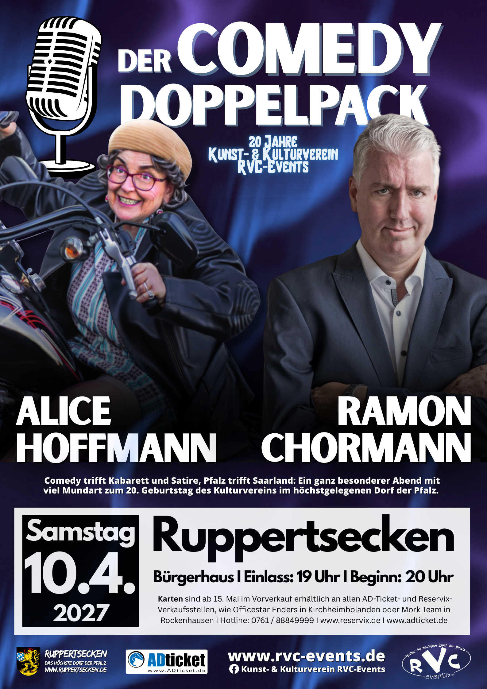 Was würde besser zum Geburtstag des Kunst- & Kulturvereins RVC-Events passen, als ein Comedy-Doppelpack mit Alice Hoffmann und Ramon Chormann, mit viel Mundart und einem Abend, bei dem die Pfalz auf das Saarland trifft? Ein Geburtstags-Feuerwerk des Kult-Duos – gemeinsam auf der Bühne im Bürgerhaus in Ruppertsecken und mit dem Besten aus den bisherigen Programmen „vom Hilde“ und „vom Pälzer“. Der Kartenvorverkauf startet am 15. Mai 2026.